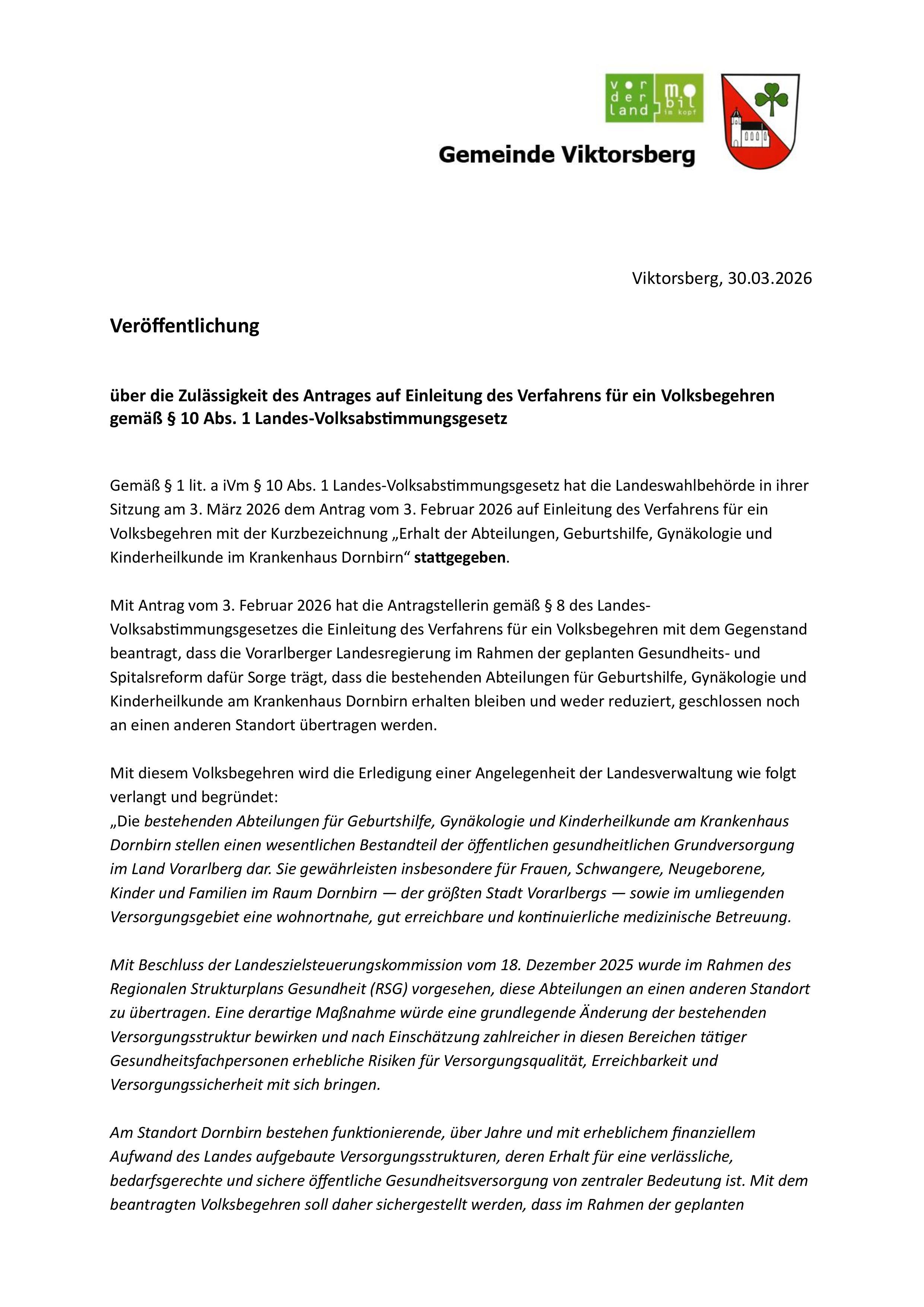Als Eintragungszeitraum für das Volksbegehren mit der Kurzbezeichnung “Erhalt der Abteilungen, Geburtshilfe, Gynäkologie und Kinderheilkunde im Krankenhaus Dornbirn” wurde der Zeitraum vom 15. April bis 10. Juni 2026 festgesetzt.