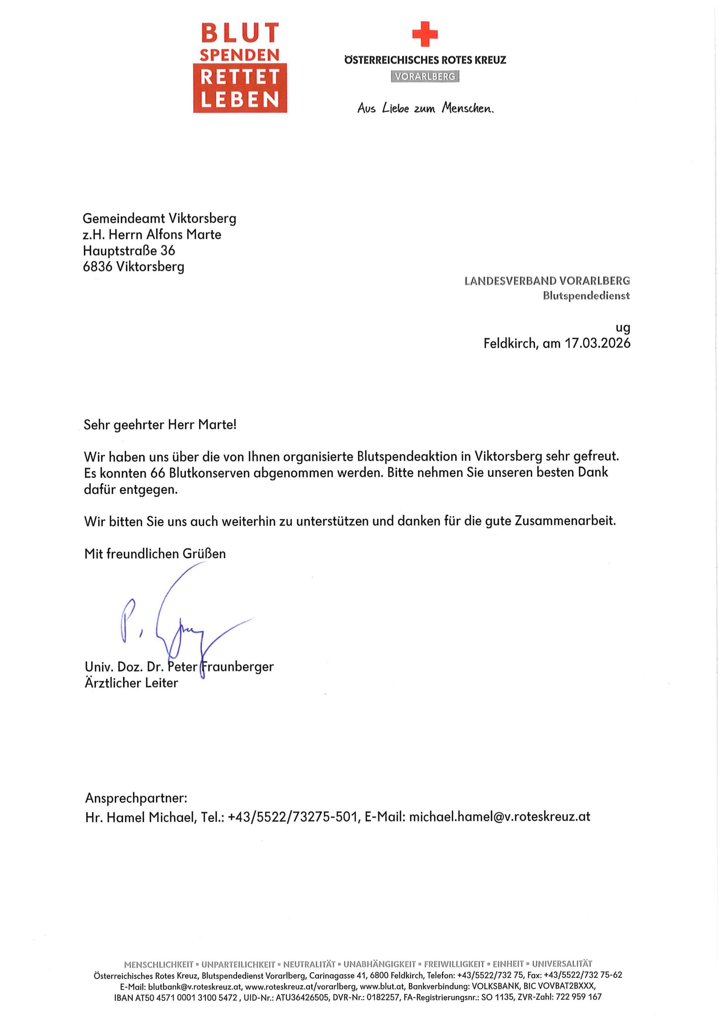 Die Blutspendeaktion in der Volksschule Viktorsberg am 16. März war ein toller Erfolg. Es konnten 66 Blutkonserven abgenommen werden.